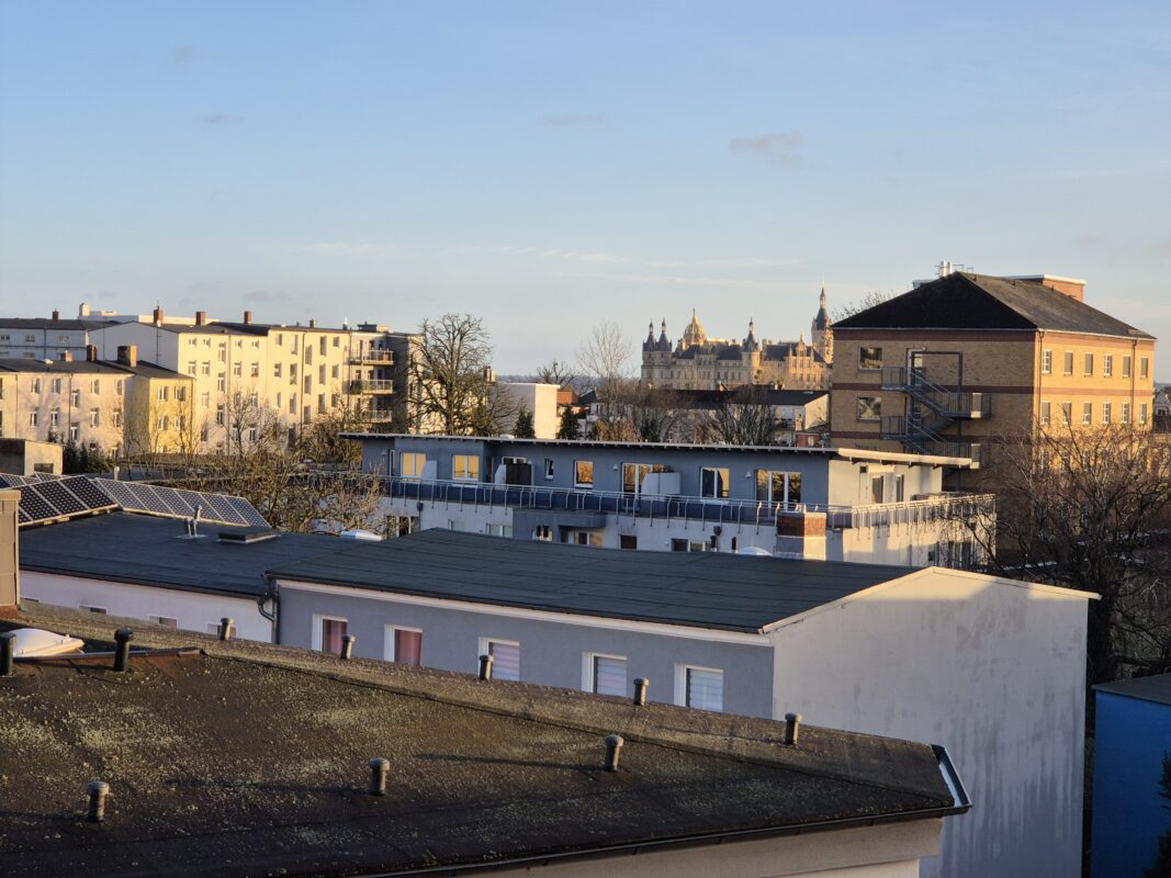 Von hier aus gelangen Sie auf die ca. 20 m² große Dachterrasse, die einen herrlichen Weitblick über Schwerin bietet.