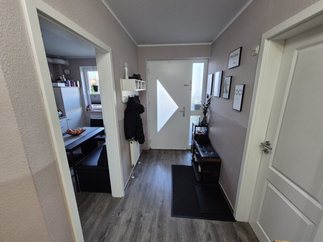 Sie erstreckt sich über zwei Etagen. Im Erdgeschoss befinden sich eine großzügige Küche inkl. Einbauküche, ein Gäste-WC sowie der Flur mit dem Treppenaufgang nach oben.