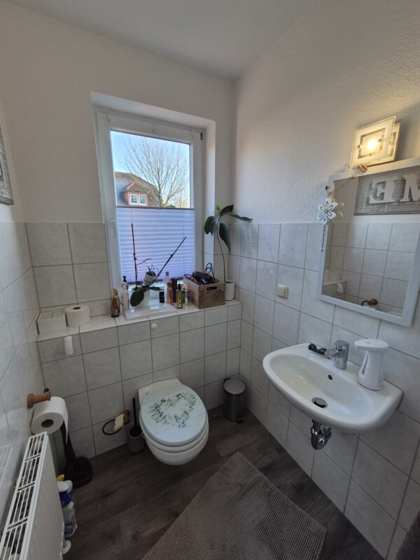 Im Erdgeschoss befinden sich zudem ein Gäste-WC mit Anschlussmöglichkeiten für Waschmaschine und Trockner sowie ein separater Hauswirtschaftsraum, welcher zusätzliche Abstellmöglichkeiten bietet.